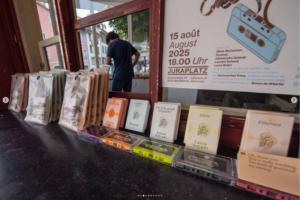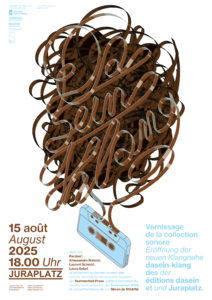 Affiche pour la présentation publique de la collection de cassettes des éditions dasein à l’espace Juraplatz, Biel/Bienne.